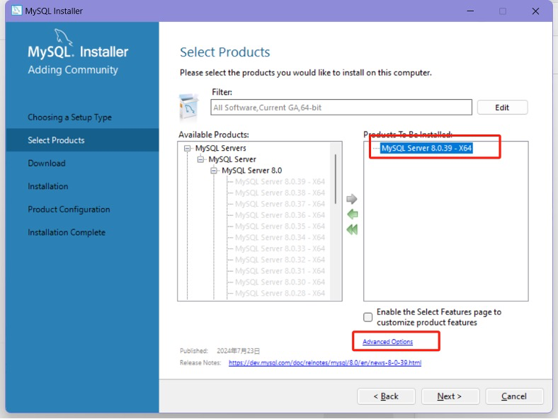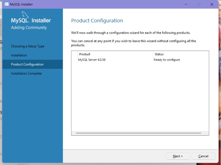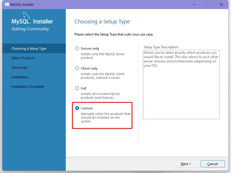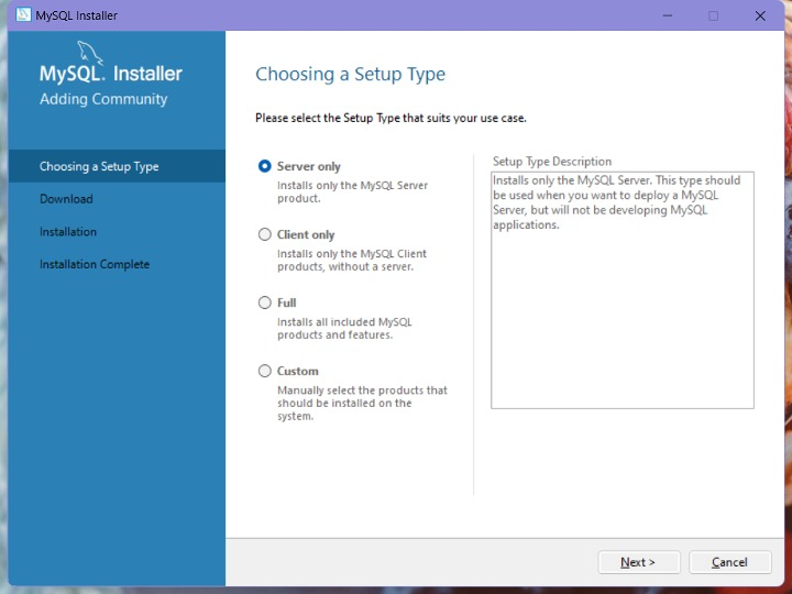 1、 打开mysql安装器,选择Server only进行下一步(Next)