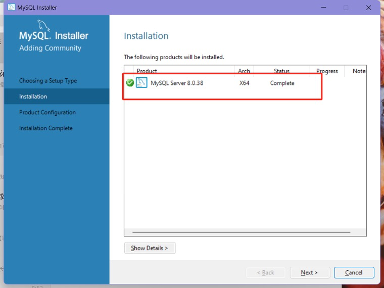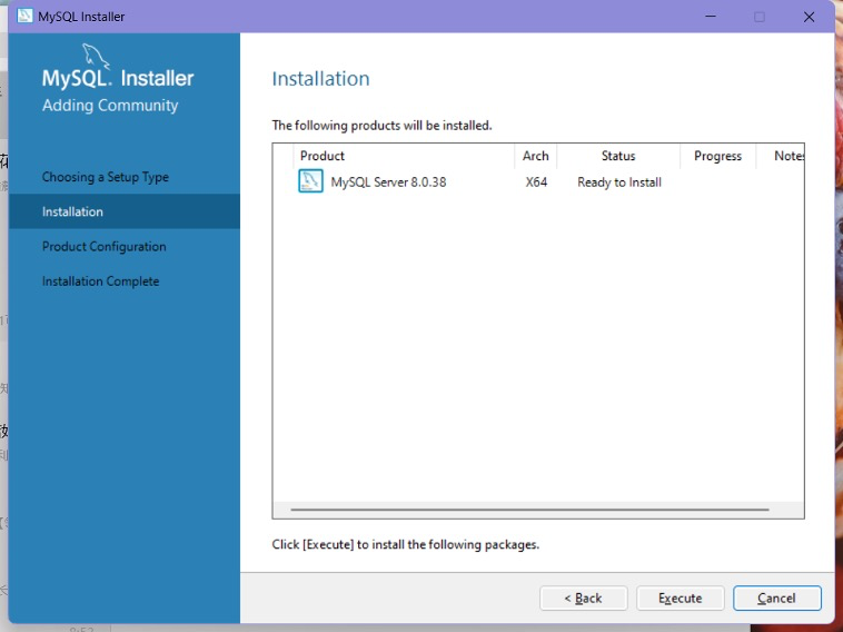 3、确认安装内容,这里表示安装Mysql Server 8,可以直接点击执行(Execute)。安装完后会显示complete