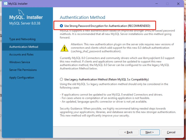 6、 其次配置加密方式,mysql8有新的加密方式,更加可靠,按默认配置即可