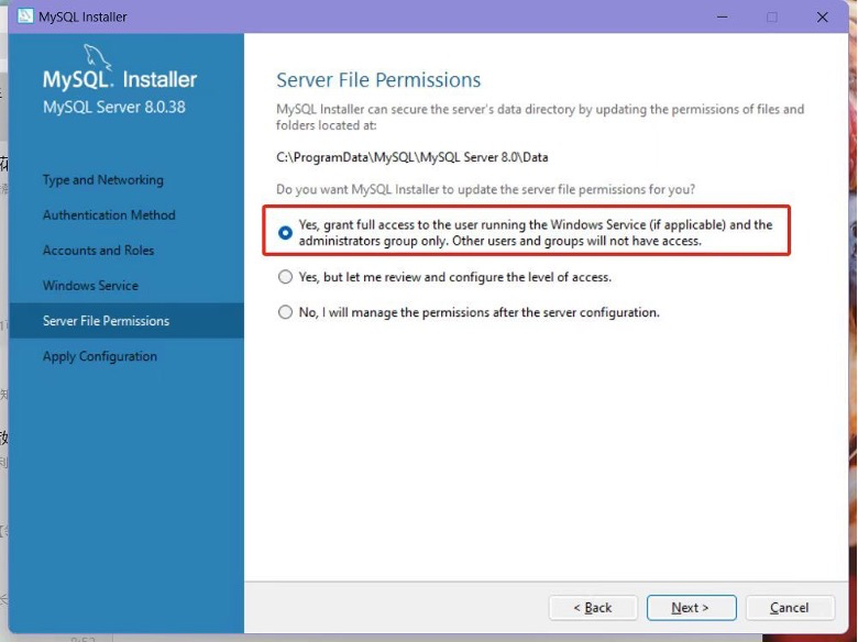9、配置文件权限,这里按默认配置选择第一个即可,表示最大权限