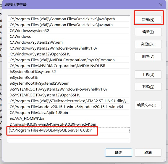 4、 在Path中点击新建,然后把Mysql的bin目录粘贴在这里,点击确定即可