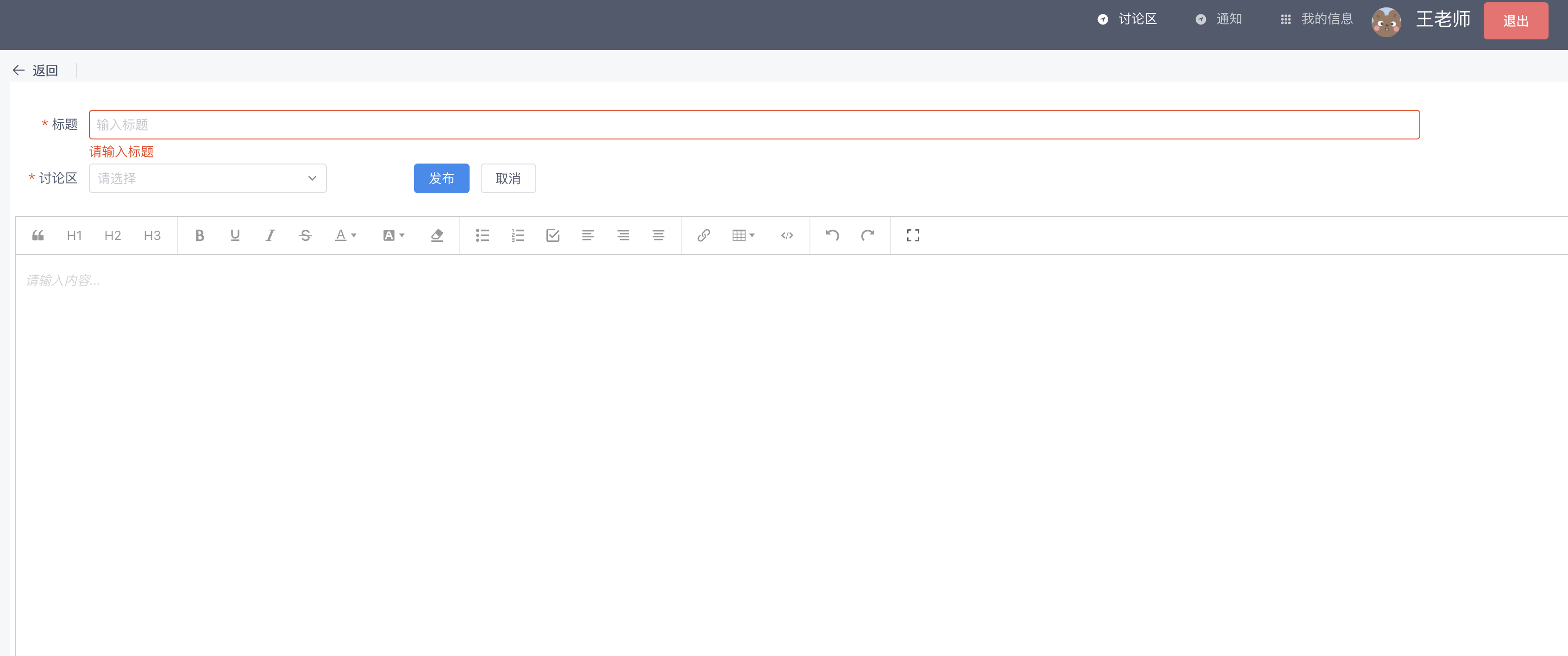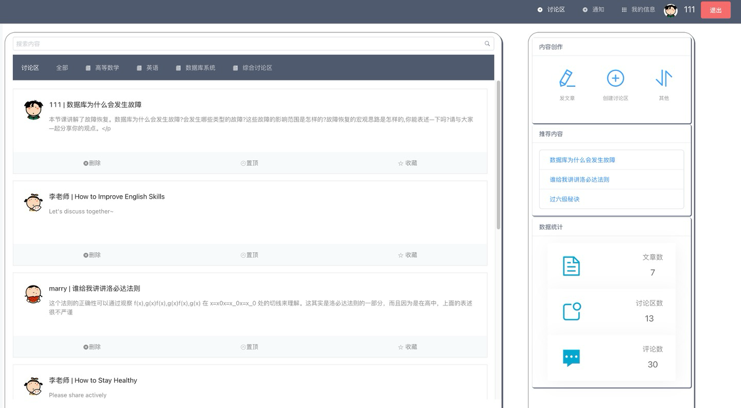 可以查看不同讨论区的文章列表,收藏、置顶(仅老师角色可以操作)文章,发表文章,查看统计数据等